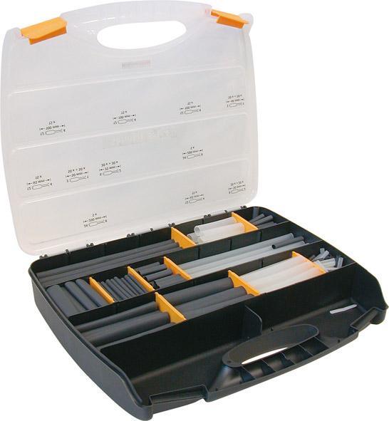 Sada termicky smrštiteľných bužírok, 385 kusov Provedenie: Vyrobené z radiačne zosieťovaného polyolefínu (PEX), čierneho a priehľadného, vonkajší plášť samozhášivý (okrem priehľadných smrštiteľných trubičiek). Bužírky sú vybavené vnútornou vrstvou lepidla, taviteľného pri vysokých teplotách, chránia sa tak pred vlhkosťou a sú týmto ideálne na aplikáciu do vonkajších priestorov. Systém nožov na káble 3.1. Izolačná trieda v súlade s VDE 0530, odolnosť proti proraženiu v súlade s ASTM D 2671. Bez obsahu silikónu, znášanlivosť s medenými vodičmi, do značnej miery odolné proti UV žiareniu, riedidlám, ako aj kyselinám a zásaditým roztokom. Dodávame v plastovom kufríku. Použitie: Ideálne na izolovanie, farebné označovanie a ako ochrana proti prehybu v elektronike a pri balení káblov. Upozornenie: Pre zabezpečenie profesionálneho výsledku by mala byť smrštiteľná bužírka smrštená najmenej o 20 % a najviac o 80 % svojej maximálnej smrštiteľnej kapacity. Výrobca: HellermannTyton GmbH, Großer Moorweg 45, 25436 Tornesch, DE, +49 4122 701 0, info@HellermannTyton.de