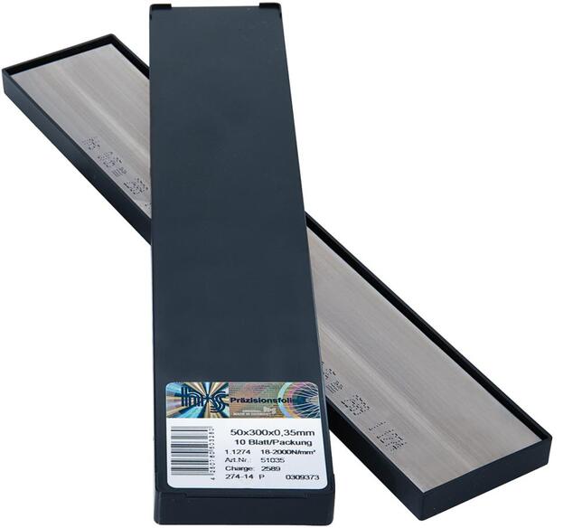 Kovová fólia, sortiment plochého tovaru, oceľ Provedenie: Kovové fólie s toleranciou hrúbky T3 z pružinovej tvrdenej pásovej ocele 1,1274. Použitie: Pre diely s vysokým stupňom opotrebenia kvôli obsahu uhlíka nad 1 %. Pre spárové meradlá v pásoch, podložné fólie, pružiny bez nároku na ochranu proti korózii. Upozornenie: Materiál je podľa normy DIN 17222 (nové: DIN EN 10 132-4) povolený pre pružiny. Stúpanie: 0,01*; 0,02*; 0,03; 0,04; 0,05; 0,06; 0,07; 0,08; 0,09; 0,10; 0,15; 0,20; 0,25; 0,30; 0,40; 0,50; 0,60; 0,70; 0,80; 0,90; 1,00 * 0,01 a 0,02 z ocele 1.4310. Výrobca: H+S Präzisionsfolien GmbH, Am Forst 10, 92648 Vohenstrauß, DE, +499614018030, info@hs-folien.de