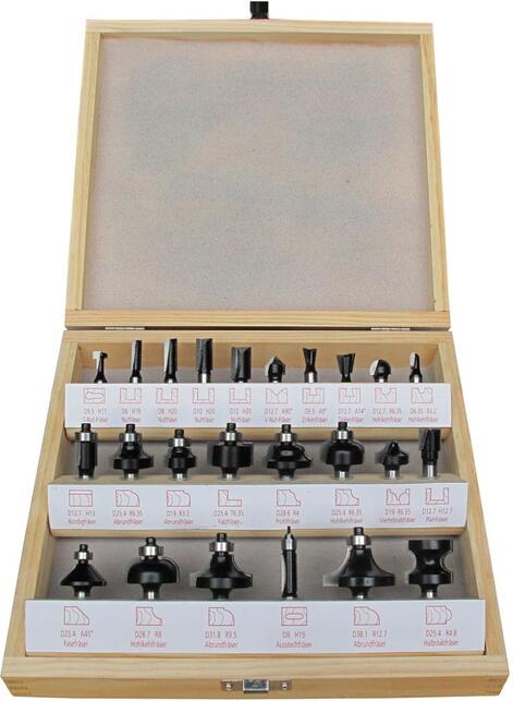 Sada stopkových fréz, 24-dielna Provedenie: S břitmi osadenými HW, Ø stopky 8 mm. Dodáva sa v drevenej kazete. Použitie: Pre mäkké drevo, tvrdé drevo a potiahnuté doskové materiály. Obsah sady: 4 ks drážkovacia fréza 6; 8; 10; 12 mm H 20 mm 1 ks fréza na čepy 9,5 mm 9° 1 ks fréza na čepy 12,7 mm 14° 1 ks fréza na T-drážky 9,5 mm H 11 mm 1 ks fréza na V drážky 12,7 mm 90° 1 ks profilová fréza 28,6 mm R 4 mm 1 ks fréza na vnútorné oblúky 6,35 mm R 3,2 mm 2 ks fréza na vnútorné oblúky 12,7; 25,4 mm R 6,35 mm 1 ks fréza na vnútorné oblúky 28,6 mm R 8 mm 1 ks zarovnávacia fréza 12,7 mm H 13 mm 1 ks fréza na polodrážky 25,4 mm T 6,35 mm 1 ks zaoblovacia fréza 19 mm R 3,2 mm 1 ks zaoblovacia fréza 25,4 mm R 6,35 mm 1 ks zaoblovacia fréza 31,8 mm R 9,5 mm 1 ks zaoblovacia fréza 38,1 mm R 12,7 mm 1 ks polkruhová fréza 25,4 mm R 4,8 mm 1 ks štvrtkruhová fréza 19 mm R 6,35 mm 1 ks fréza na úkosy 25,4 mm 45° 1 ks rovinná fréza 12,7 mm H 12,7 mm 1 ks dlabačka 8 mm H 19 mm Výrobca: Einkaufsbüro Deutscher Eisenhändler GmbH, EDE Platz 1, 42389 Wuppertal, DE, +4920260960, webkontakt@ede.de