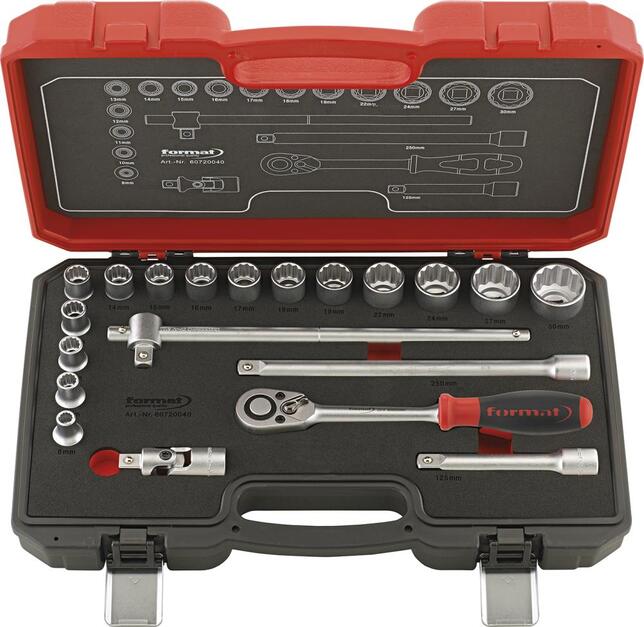 Sada dvanásťhranných nástrčných kľúčov 1/2" Provedenie: Náradie vyrobené z chrómovanej vanádiovej ocele, matne pochromované, vložky nástrčných kľúčov s rádlovaním, inbusy a štvorkrátky majú zaoblené rohy kvôli ochrane trnu a hlavy skrutky. Ráčna s prepínacou páčkou má 72 zubov, uhol spätného otočenia 5°, 2-složkovú plastovú rukoväť. Dodáva sa v robustnom plastovom boxe so schematickým prehľadom uloženia vo veku. Náradie je stabilne uložené v 2-barevnej penovej vložke, tým sa dá okamžite zistiť, ktoré náradie chýba. Výrobca: Einkaufsbüro Deutscher Eisenhändler GmbH, EDE Platz 1, 42389 Wuppertal, DE, +4920260960, webkontakt@ede.de
