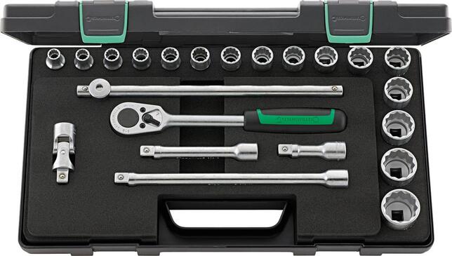 Sada dvanástichhranných nástrčných kľúčov 1/2" Provedenie: Z ocele legovanej chrómom, pochromovaná. Vložky nástrčných kľúčov HPQ®-vysoko výkonné ocele, s ryhovaním. Nástroje sú stabilne upevnené v penovej vložke. Dodáva sa v stohovateľnom plastovom boxe z ABS. Výrobca: STAHLWILLE Eduard Wille GmbH & Co. KG, Lindenallee 27, 42349 Wuppertal, DE, +4920247910, info@stahlwille.de
