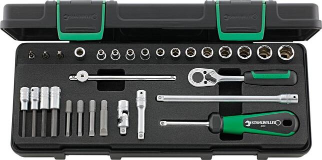 Sada šesťhranných nástrčných kľúčov 1/4", 30-dielna Provedenie: Z ocele legovanej chrómom, pochromovaná. Vložky pre šesťhranné nástrčné kľúče z HPQ®-vysoko výkonej ocele. Nástroje sú stabilne upevnené v penovej vložke. Dodanie v stohovateľnom plastovom boxe z ABS. Obsah sady: 1 ráčna s prepínacou páčkou 12 vložiek pre šesťhranné nástrčné kľúče 4;4,5; 5; 5,5; 6; 7; 8; 9; 10; 11; 12; 13 mm 4 adaptér-bity, inbus, 3; 4; 5; 6 mm 4 bity s plochou drážkou 3,5; 4; 5,5; 8 mm 3 bity, krížové PH 1; 2; 3 2 predĺženia 54; 150 mm 1 priečna rukoväť so smýkadlom 1 nástrčná rukoväť 1 krížový kĺb 1 držiak bitov Výrobca: STAHLWILLE Eduard Wille GmbH & Co. KG, Lindenallee 27, 42349 Wuppertal, DE, +4920247910, info@stahlwille.de