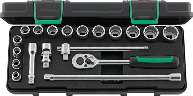 Sada dvanástichhranných nástrčných kľúčov 3/8", 19dielna Provedenie: Z ocele legovanej chrómom, pochromovaná. Vložky pre šesťhranné nástrčné kľúče z HPQ®-vysoko výkonných oceľových. Nástroje sú stabilne upevnené v penovej vložke. Dodanie v stohovateľnom plastovom boxe z ABS. Výrobca: STAHLWILLE Eduard Wille GmbH & Co. KG, Lindenallee 27, 42349 Wuppertal, DE, +4920247910, info@stahlwille.de