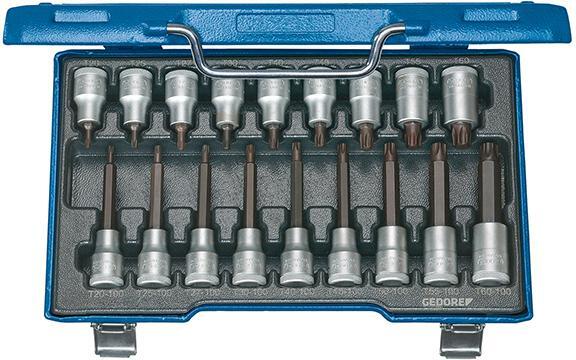 Sada adaptér-bitov 1/2" pre skrutky s vnútorným TORX®, 18-dielna Vyhotovenie: Z vanádiovej ocele GEDORE 31CrV3, brúsené a pochromované, so záchytnou drážkou guľôčky a drsným krížovým ryhovaním. Hroty hlavíc pre vnútorný TORX® zo špeciálnej vanádiovej ocele GEDORE, s mangánovým fosfátovaním. Dodáva sa v modrej kazete z oceľového plechu GEDORIT s ABS plastovou vložkou. Výrobca: GEDORE Werkzeugfabrik GmbH & Co. KG, Remscheider Straße 149, 42899 Remscheid, DE, +492191596900, gedore.empfang@gedore.com