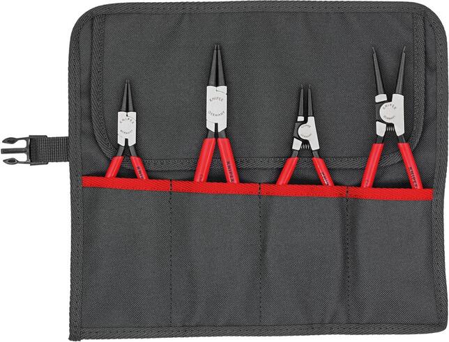 Sada klieští na poistné krúžky Provedenie: DIN 5254 A a 5256 C (rovný tvar) a DIN 5254 B a 5256 D (zalomený tvar). Kované z chromvanádiovej ocele, v oleji kalené a popúšťané, hlava leštená. Špeciálny tvar hrotov zabraňuje skĺznutiu. Rukoväte s plastovými návlekmi. Dodávame v nylonovej rolovacej taške. Výrobca: KNIPEX-Werk C. Gustav Putsch KG, Oberkamper Str. 13, 42349 Wuppertal, DE, +4920247940, info@knipex.de