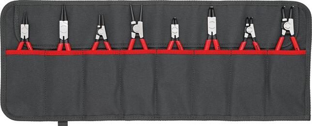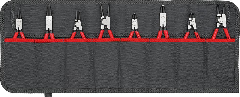 Sada klieští na poistné krúžky Provedenie: DIN 5254 A a 5256 C (rovný tvar) a DIN 5254 B a 5256 D (zalomený tvar). Kované z chromvanádiovej ocele, v oleji kalené a popúšťané, hlava leštená. Špeciálny tvar hrotov zabraňuje skĺznutiu. Rukoväte s plastovými návlekmi. Dodávame v nylonovej rolovacej taške. Výrobca: KNIPEX-Werk C. Gustav Putsch KG, Oberkamper Str. 13, 42349 Wuppertal, DE, +4920247940, info@knipex.de
