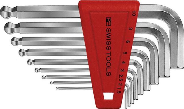Sada imbusových kľúčov, s guľovou hlavou Provedenie: DIN 911, ČSN ISO 2936 K. Z vysoko legovanej pružinovej ocele, zakalené a pochromované. S guľovou hlavou a skoseným krátkym ramenom. Dodávame v ručnom držadle. Výrobca: PB Swiss Tools AG, Bahnhofstrasse 24, 3457 Wasen/Bern, CH, +41 34 437 71 71, info(at)pbswisstools.com