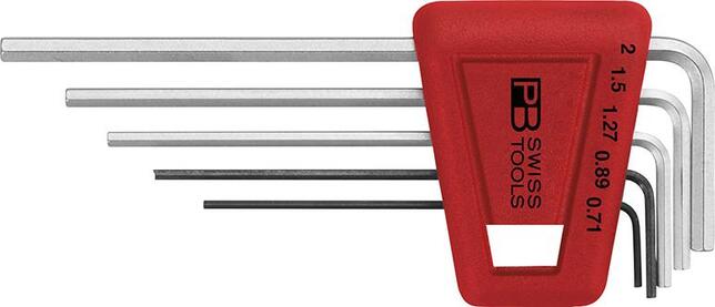 Sada imbusových kľúčov Provedenie: DIN 911, ČSN ISO 2936 K. Z vysoko legovanej pružinovej ocele, prekalenej a pochromovanej. Konce kľúčov rovné. Dodávame v ručnom držadle. Výrobca: PB Swiss Tools AG, Bahnhofstrasse 24, 3457 Wasen/Bern, CH, +41 34 437 71 71, info(at)pbswisstools.com
