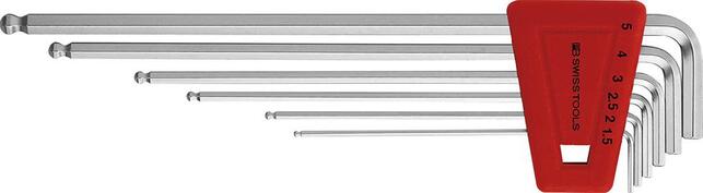 Sada inbusových kľúčov pre šesťhran, s guľovou hlavou Provedenie: DIN 911.L, ČSN ISO 2936. Z vysoko legovanej pružinovej ocele, nepretržite kalené, pochromované. S guľovou hlavou a krátkym zkoseným ramenom. Dodávame v vreckovom držiaku. Upozornenie: Vďaka špeciálnemu guľovému koncu sa hodí na skrutkovanie pod uhlom 30°. Výrobca: PB Swiss Tools AG, Bahnhofstrasse 24, 3457 Wasen/Bern, CH, +41 34 437 71 71, info(at)pbswisstools.com