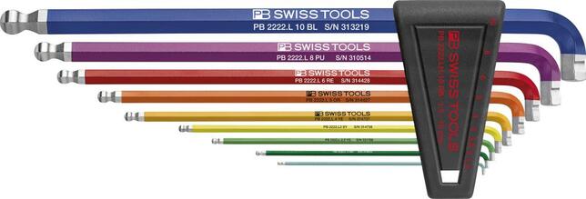 Sada dlhých imbusových kľúčov pre šesťhran, s guľovou hlavou a so skráteným ramenom 90-100°, Rainbow Vyhotovenie: DIN 911 L, ČSN ISO 2936 L. Z vysoko legovanej pružinovej ocele, zakalené, pochromované a opatrené práškovým lakom. S guľovou hlavou a skráteným pružným ramenom zalomeným o 90°–100°. Poloha 90° pre nasadenie, miernym ťahom je možné zväčšiť skrutkovací uhol na 100°. Povrchová úprava v rozmanitých farbách uľahčuje priradenie otvorov kľúčov. Dodávame v vreckovom držiaku. Použitie: Ideálne na skrutkovacie práce v stiesnených miestach s ťažkým prístupom. Upozornenie: Veľkosti 1,5–2 mm s pevným uhlom 90°. Výrobca: PB Swiss Tools AG, Bahnhofstrasse 24, 3457 Wasen/Bern, CH, +41 34 437 71 71, info(at)pbswisstools.com
