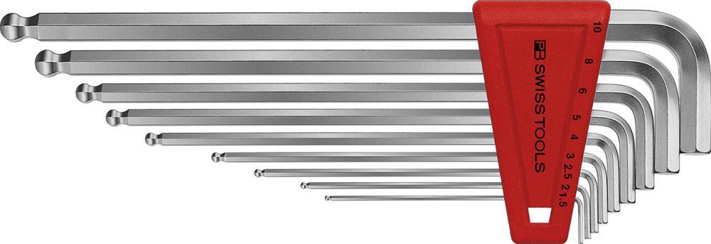 Sada imbusových kľúčov pre šesťhran, s guľovou hlavou Provedenie: DIN 911.L, ČSN ISO 2936. Z vysoko legovanej pružinovej ocele, nepretržite kalené, pochromované. S guľovou hlavou a krátkym zkoseným ramenom. Dodávame v vreckovom držiaku. Upozornenie: Vďaka špeciálnemu guľovému koncu sa hodí na skrutkovanie pod uhlom 30°. Výrobca: PB Swiss Tools AG, Bahnhofstrasse 24, 3457 Wasen/Bern, CH, +41 34 437 71 71, info(at)pbswisstools.com