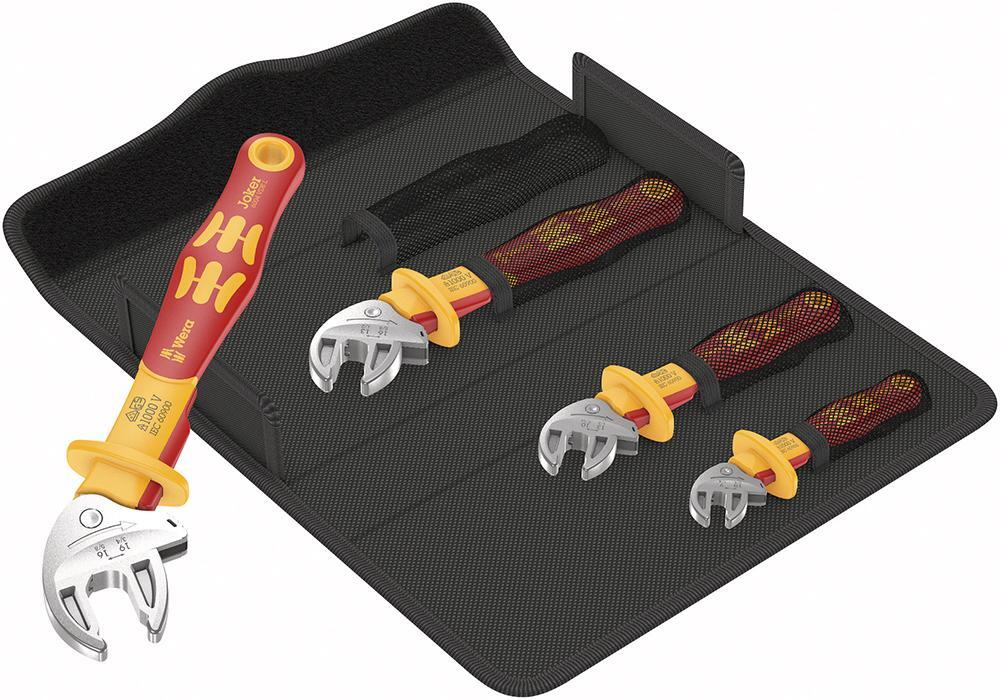 Sada vidlicového kľúča Joker VDE, samonastavovací Provedenie: S pohyblivo uloženou hlavou pre skrutkovanie podľa princípu ráčny s uhlom spätného výkyvu 30°. Paralelné, rovné čeľuste sa automaticky plynule nastaví na potrebný otvor kľúča. Skrutka sa bezpečne upne pomocou integrovaného pákového mechanizmu a znižuje tak riziko vyklznutia. Dodáva sa vo veľmi kompaktnom textilnom boxe, ktorý chráni citlivé povrchy. Použitie: K rýchlemu, priebežnému skrutkovaniu aj v stiesnených podmienkach. Rukoväť izolovaná do 1000 V podľa IEC 60900, DIN EN 60900. Výrobca: Wera Werkzeuge GmbH, Korzerter Str. 21-25, 42349 Wuppertal, DE, +4920240450, sales@wera.de