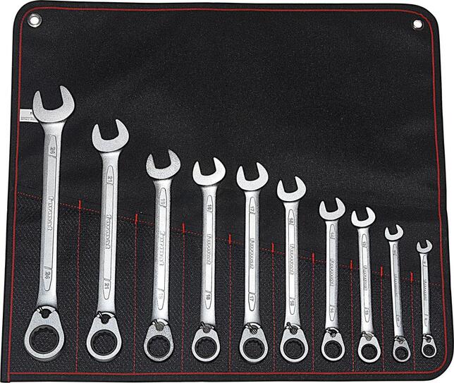 Ráčnový kľúč očkový vidlicový, prepínateľný, v sade Vyhotovenie: Z chrómvanádiovej ocele, pochromovaná. Presný ozubený ráčnový mechanizmus so 72 zubami a nastavovacím uhlom o 5°. Ráčnová hlava je zahnutá pod uhlom 15°. Vidlica kľúča zalomená pod uhlom 15°. Točivé momenty prekračujú minimálne hodnoty stanovené podľa noriem DIN 3113. Dodávame v rolovacej taške. Výrobca: Einkaufsbüro Deutscher Eisenhändler GmbH, EDE Platz 1, 42389 Wuppertal, DE, +4920260960, webkontakt@ede.de