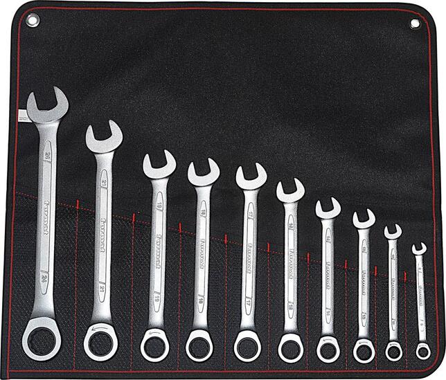 Sada vidlicových kľúčov s očkovou ráčnou Provedenie: Z chrómovej vanádiovej ocele. Pochromovaný, rovný tvar. Presný ozubený ráčnový mechanizmus so 72 zubami a nastavovacím uhlom o 5°. Poloha vidlice kľúča 15°. Utahovacie momenty predčia hodnoty stanovené podľa normy DIN 3110, ČSN ISO 3318. Dodáva sa v rolovacej taške. Výrobca: Einkaufsbüro Deutscher Eisenhändler GmbH, EDE Platz 1, 42389 Wuppertal, DE, +4920260960, webkontakt@ede.de