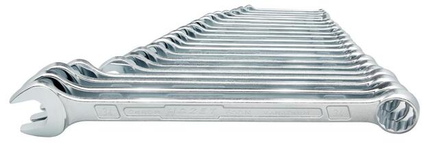 Sada očkových vidlicových kľúčov, rovných Provedenie: DIN 3113, ISO 3318, tvar A. Kovaná matne chrómovaná chrómvanádiová oceľ, očko zalomené pod uhlom 15°, stabilný dĺžka s profilom dvojitého T. Výrobca: HAZET-WERK Hermann Zerver GmbH & Co. KG, Güldenwerther Bahnhofstr. 25-29, 42857 Remscheid, DE, +4921917920, info@hazet.de