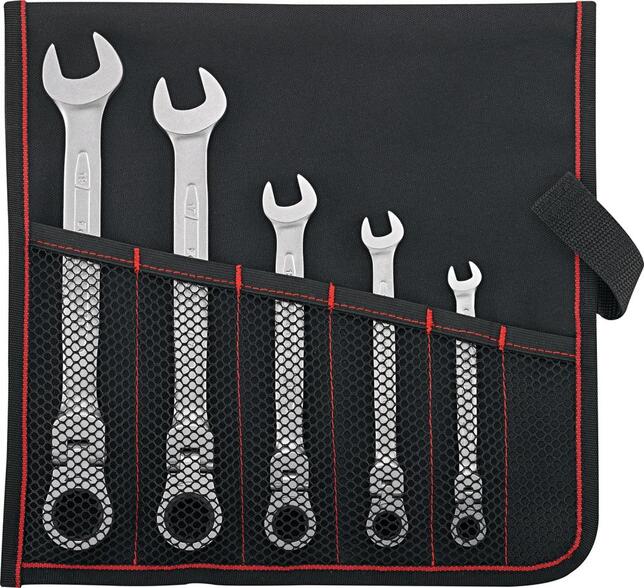 Ráčnový kľúč očkový vidlicový s kĺbom v sade Prevedenie: Z chrómovanej vanádiovej ocele. Pochromovaný, rovný tvar. Presný ozubený ráčnový mechanizmus so 72 zubami a nastavovacím uhlom o 5°. Poloha vidlice kľúča 15°. Ráčnovú hlavu je možné naklápať v uhle 180°. Utahovacie momenty predčia hodnoty stanovené podľa normy DIN 3110, ISO 3318. Dodávame v nylonovej rolovacej taške. Výrobca: Einkaufsbüro Deutscher Eisenhändler GmbH, EDE Platz 1, 42389 Wuppertal, DE, +4920260960, webkontakt@ede.de