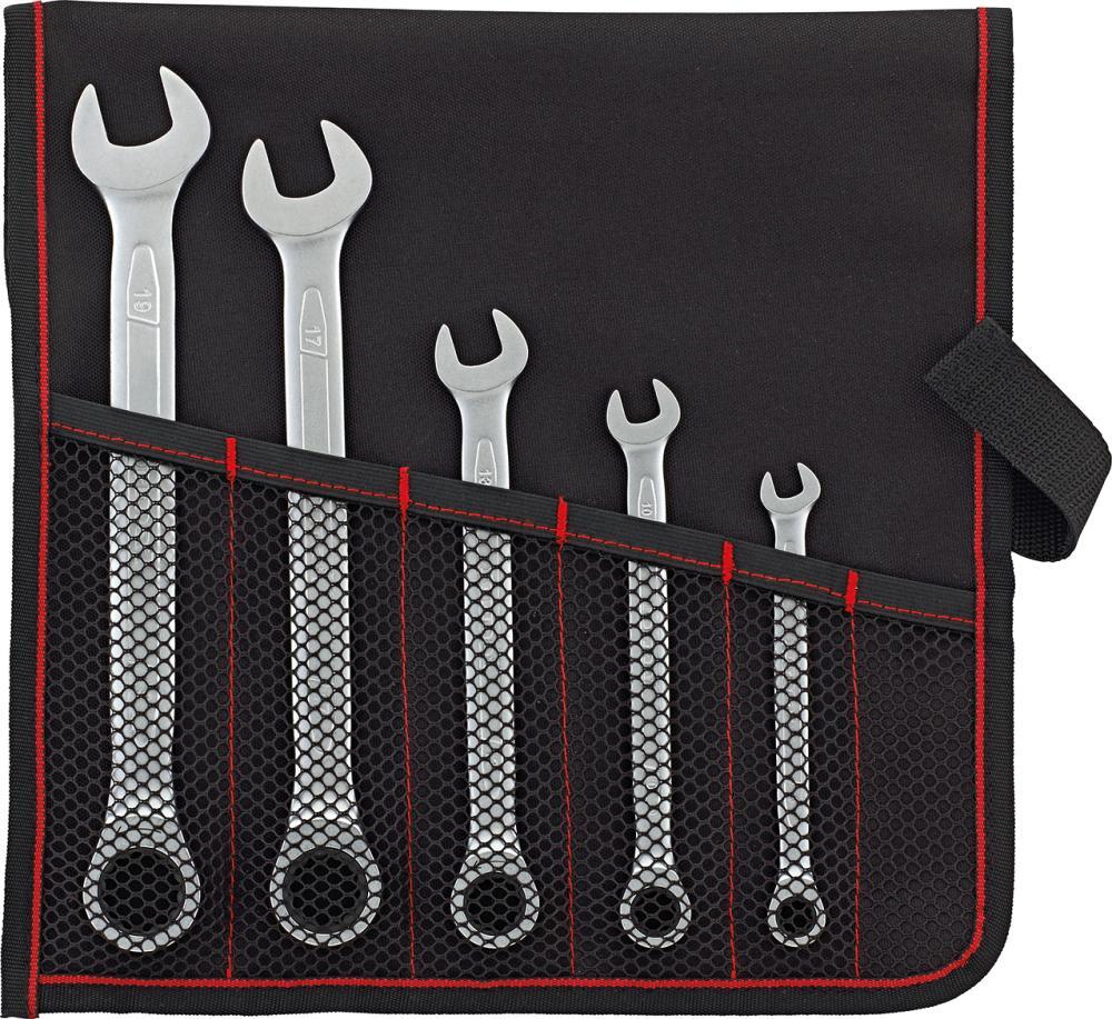 Sada vidlicových kľúčov s očkovou ráčnou Provedenie: Z chrómovanej vanádiovej ocele. Pochromovaný, rovný tvar. Presný ozubený ráčnový mechanizmus so 72 zubami a nastavovacím uhlom o 5°. Poloha vidlice kľúča 15°. Utahovacie momenty predčia hodnoty stanovené podľa normy DIN 3110, ČSN ISO 3318. Dodáva sa v rolovacej taške. Výrobca: Einkaufsbüro Deutscher Eisenhändler GmbH, EDE Platz 1, 42389 Wuppertal, DE, +4920260960, webkontakt@ede.de