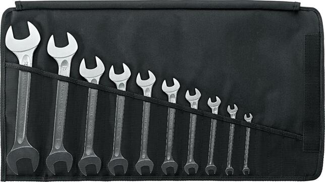 Sada obojstranných vidlicových kľúčov, v rolovacom puzdre Prevedenie: DIN 3110, ISO 3318. Matne pochromované, čeľuste zalomené pod uhlom 15°, s plochými hlavami. Dodáva sa v rolovacej taške. Z chrómovej ocele, pochromované. Stabilný driek s profilom dvojitého T. Výrobca: STAHLWILLE Eduard Wille GmbH & Co. KG, Lindenallee 27, 42349 Wuppertal, DE, +4920247910, info@stahlwille.de