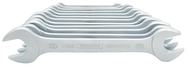 Sada obojstranné vidlicové kľúče Provedenie: DIN 3110, ISO 3318. Matne pochromované, čeľuste zalomené pod uhlom 15°, s plochými hlavami. Dodáva sa v kartóne. Z GEDORE vanádiovej ocele 31CrV3. Hlava jemne brúsená. Úchopný, oválny dřík. Výrobca: GEDORE Werkzeugfabrik GmbH & Co. KG, Remscheider Straße 149, 42899 Remscheid, DE, +492191596900, gedore.empfang@gedore.com