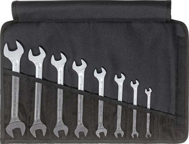 Sada obojstranných vidlicových kľúčov, v rolovacom puzdre Vyhotovenie: DIN 3110, ISO 3318. Matne chrómované, čeľuste zalomené pod uhlom 15°, s plochými hlavami. Dodáva sa v rolovacej taške. Z chrómovej ocele, chrómované. Stabilný hriadeľ s profilom dvojitého T. Výrobca: STAHLWILLE Eduard Wille GmbH & Co. KG, Lindenallee 27, 42349 Wuppertal, DE, +4920247910, info@stahlwille.de