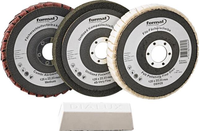 Sada na leštenie v 3 definovaných krokoch Provedenie: Dodanie vrátane kombinovaného brúsneho lamelového kotúča, kompaktného brúsneho kotúča, filcového lamelového brúsneho kotúča a leštiacej pasty. Použitie: Hodí sa okrem iného na leštenie uhlovou brúskou s nízkym počtom otáčok. 1. Krok: Kombinovaným lamelovým brúsnym kotúčom odstráňte zvary, ihly a menšie povrchové nerovnosti. Kombináciou brúsnej plsti a brúsiva aplikovaného ako brúsny podklad možno dva pracovné kroky skrátiť do jedného. Vhodné aj na opracovanie hliníka. 2. Krok: Kompaktným brúsnym kotúčom vyleštíte stopy chybných brúsení a vyrovnáte povrchové plochy. Kompaktný brúsny kotúč sa okrem toho môže používať na prípravné leštenie, výsledkom je dekoratívne dokončenie povrchovej plochy. 3. Krok: Filcový lamelový kotúč a leštiaca pasta sú optimálnou kombináciou na leštenie do vysokého lesku. Výrobca: Einkaufsbüro Deutscher Eisenhändler GmbH, EDE Platz 1, 42389 Wuppertal, DE, +4920260960, webkontakt@ede.de
