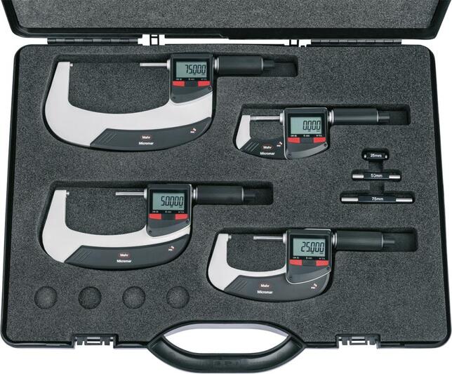 Sada digitálnych mikrometrov, IP65, dátový výstup Provedenie: Vreteno nerez, tvrdené a brúsené, lakovaný oceľový tŕň, ráčna vytiahnutá dopredu, rýchlopohon a tepelná ochrana rúk. Výška číslic na LCD displeji 8,5 mm, stupeň krytia IP65, dátové rozhranie RS232, Digimatic a USB. Dodanie s batériou CR2032. Funkcie: Zapnutie a automatické vypnutie, prepínanie mm/palce, automatické zapnutie otočením meracím tlačidlom, blokácia tlačidla pre nastavenú nulovú polohu, po zapnutí nie je nutné znovu nastavovať nulu (absolútny systém), ABS (prepínanie z relatívneho na absolútne meranie), reset (vynulovanie) je možné aktivovať v každej pozícii, funkcia prednastavenia (rozsah meracích hodnôt). Výrobca: Mahr GmbH, Carl-Mahr-Str. 1, 37073 Göttingen, DE, +49 551 7073 0, info@mahr.com