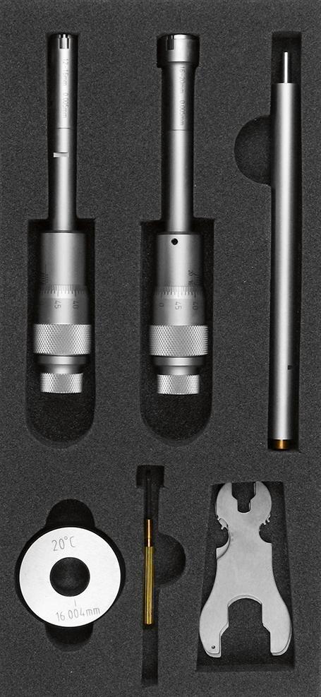 Sada dutinových mikrometrov Provedenie: Odcítavacie súčasti matne pochromované, merací bubienok s jemnou ráčnou, meracie plošky osadené tvrdokovom. Do meracieho rozsahu 5-6 mm s 2-bodovým meraním, od meracieho rozsahu 6-8 mm s 3-bodovým meraním. Dodávame s kalibračnými krúžkami a skrutkovačom, v plastovom boxe. Použitie: Na priechodné a slepé otvory. Výrobca: Einkaufsbüro Deutscher Eisenhändler GmbH, EDE Platz 1, 42389 Wuppertal, DE, +4920260960, webkontakt@ede.de