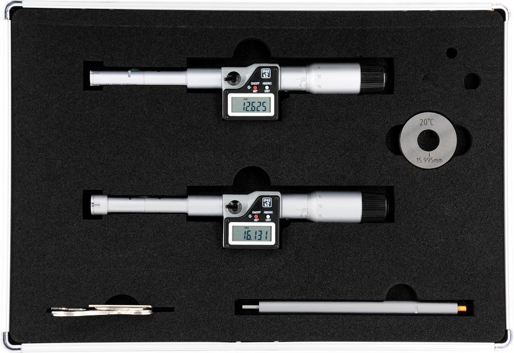 Sada digitálnych dutinových mikrometrov Provedenie: S 3liniovým kontaktom, meracie plochy z tvrdokovu, samostrediacia meracia hlava, puzdro stupnice a puzdro matne chrómované. Dodávame vrátane batérie CR2032, 3 V, v hliníkovom boxe. Funkcia: Prepínanie mm/palce, automatické zapnutie otočením bubínka, blokácia tlačidla pre nastavenú nulovú pozíciu, nie je nutné zadávať nulovú pozíciu po každom zapnutí (absolútny systém), reset (vynulovanie) je možné aktivovať na každej pozícii, funkcia prednastavenia (rozsah meracích hodnôt), ABS (prepínanie z relatívneho na absolútne meranie). Použitie: Na priechodné a slepé otvory. Výrobca: Einkaufsbüro Deutscher Eisenhändler GmbH, EDE Platz 1, 42389 Wuppertal, DE, +4920260960, webkontakt@ede.de