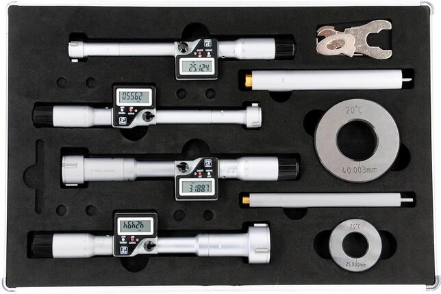 Sada digitálnych dutinových mikrometrov Provedenie: S 3liniovým kontaktom, meracie plochy z tvrdokovu, samostrediacia meracia hlava, puzdro stupnice a puzdro matne chrómované. Dodávame vrátane batérie CR2032, 3 V, v hliníkovom boxe. Funkcia: Prepínanie mm/palce, automatické zapnutie otočením bubínka, blokácia tlačidla pre nastavenú nulovú pozíciu, nie je nutné zadávať nulovú pozíciu po každom zapnutí (absolútny systém), reset (vynulovanie) je možné aktivovať na každej pozícii, funkcia prednastavenia (rozsah meracích hodnôt), ABS (prepínanie z relatívneho na absolútne meranie). Použitie: Na priechodné a slepé otvory. Výrobca: Einkaufsbüro Deutscher Eisenhändler GmbH, EDE Platz 1, 42389 Wuppertal, DE, +4920260960, webkontakt@ede.de