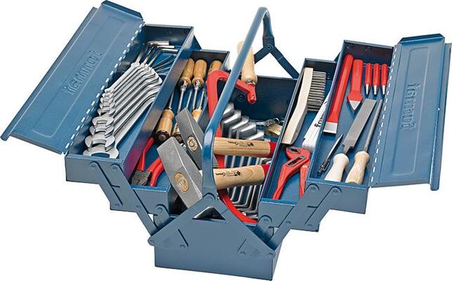 Sada zámočníckeho náradia, 56 kusov Obsah sady: 1 skrinka na náradie z oceľového plechu 1 kliešte na vodné čerpadlá, 240 mm 1 kombinované kliešte, 180 mm 1 bočné štípacie kliešte, 160 mm 1 sada obojstranných vidlicových kľúčov, 9 ks, 6-32 mm 1 sada obojstranných očkových kľúčov, 12 ks, 6-32 mm 1 sada inbusových kľúčov, šesťhran, 8 ks, na prstenci, 2-10 mm 1 sada skrutkovačov, 6 ks, s drevenou rukoväťou 1 dôlčík, 120 x 12 mm 2 priebory 3; 5 mm 2 zámočnícke kladivá s ochranným puzdrom násady 500; 1000 g 1 rám píly na kov, 300 mm 1 list pre ručnú pílu HSS-bimetal, 300 mm 1 rysovacia ihla z tvrdokovu, 150 mm 1 kefa z oceľového drôtu, 4 radový 1 plochý obdĺžnikový pilník, 200 mm sek 2 1 guľatý pilník, 200 mm, sek 2 2 rukoväte pre pilník 1 plochý sekáč, 300 mm 1 krížový sekáč, 200 mm 1 drevený skladací meter, 2 m 1 visiaci zámok, 40 mm Upozornenie: Všetky nástroje v uvedenej sade zodpovedajú popisom jednotlivých výrobkov v tomto katalógu. Vyhradzujeme si právo na zmenu zloženia sady. Výrobca: Einkaufsbüro Deutscher Eisenhändler GmbH, EDE Platz 1, 42389 Wuppertal, DE, +4920260960, webkontakt@ede.de