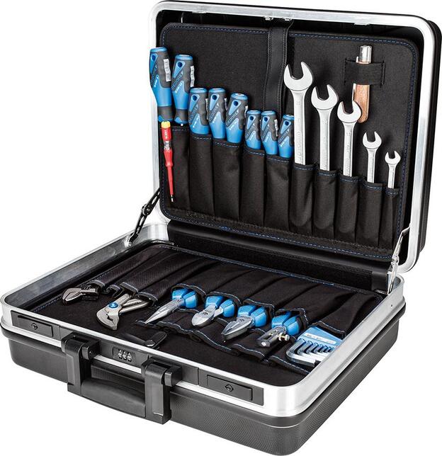 Sada náradia, 74 kusov Obsah sady: 1 plastový kufor 5 krúžkových vidlicových kľúčov 10; 13; 17; 19; 22 mm 1 sada nástrčných kľúčov, 35 kusov 1 sada uhlových skrutkovačov, 8 kusov, 2; 2,5; 3; 4; 5; 6; 8; 10 mm 5 skrutkovačov, plochých 3; 4; 5,5; 6,5; 8 mm 3 skrutkovače, krížová drážka PH 0; 1; 2 1 staviteľný kľúč 8" 1 šetrné kladivo, bez spätného rázu 1 vreckové posuvné meradlo 1 vreckové meracie pásmo, 3 m 1 odizolovacie kliešte, 160 mm 1 kombinované kliešte, 200 mm 1 silové kombinované kliešte, 180 mm 1 silové bočné štípacie kliešte, 160 mm 1 kliešte na vodné čerpadlá, 10" 1 sada príklepového náradia, 6 kusov 1 skúšačka fáz, 1 pólová 1 nôž na káble, 1 kus 1 drôtený kartáč, 3-riadkový Výrobca: GEDORE Werkzeugfabrik GmbH & Co. KG, Remscheider Straße 149, 42899 Remscheid, DE, +492191596900, gedore.empfang@gedore.com
