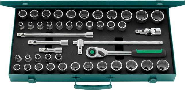 Sada dvanástichhranných nástrčných kľúčov 1/2", 45-dielna Provedenie: Z ocele legovanej chrómom, pochromované. Vložky nástrčných kľúčov HPQ®-vysoko výkonné ocele, s ryhovaním. Ráčna s prepínacou páčkou, nadstavce, priečna rukoväť s kardanovým kĺbom s funkciou rýchleho uvoľnenia QuickRelease. Nástroje sú stabilne upevnené v penovej vložke. Dodanie v skrinke z oceľového plechu. Výrobca: STAHLWILLE Eduard Wille GmbH & Co. KG, Lindenallee 27, 42349 Wuppertal, DE, +4920247910, info@stahlwille.de