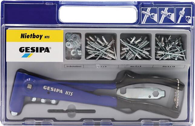 Sada trhacích nýtov Nietboy NTS Provedenie: Z kvalitného hliníkového tlakového odliatku s kovanými ramenami klieští z ocele. Úzka hlava klieští umožňuje prácu aj na ťažko prístupných miestach. Okrem toho majú ručné nýtovacie kliešte rukoväte vhodné pre ruky, otváraciu pružinu pre automatické vysunutie trnu, ako aj záchytný klip. Dodáva sa v plastovom boxe s držadlom na prenášanie. Dodávame v plastovom kufríku. Použitie: Pre hliník do Ø 5 mm, oceľ a nerez do Ø 4 mm. Rozsah dodávky: Ručné nýtovacie kliešte NTH, 4 špičky 10/18, 10/24, 10/27, 10/32. Priřadenie špičiek: ∅ nýtu: 2,4; materiál: Hliník; špička: 10/18 ∅ nýtu: 3,2; materiály: CAP hliník, CAP meď; špička: 10/18 ∅ nýtu: 3 a 3,2; materiály: Hliník, meď, oceľ, nerez, Stinox, hliník/hliník, PG-hliník, PG-oceľ; špička: 10/24 ∅ nýtu: 4; materiály: Hliník; meď; špička: 10/24 ∅ nýtu: 4; materiály: Oceľ, CAP hliník, CAP meď, hliník/hliník, PG-hliník; špička: 10/27 ∅ nýtu: 4; materiály: Nerez, Stinox, PG-oceľ; špička: 10/29 ∅ nýtu: 4,8; materiály: CAP hliník, CAP meď; špička: 10/29 ∅ nýtu: 4,8 a 5; materiály: Hliník, PG hliník; špička: 10/32 Výrobca: GESIPA Blindniettechnik GmbH, Nordendstr. 13-39, 64546 Mörfelden-Walldorf, DE, +49 6105 962-0, info@gesipa.com