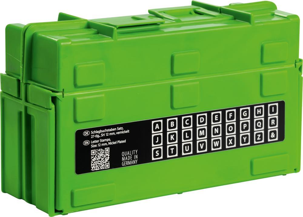 Písmenové raznice Provedenie: 27diel. (A–Z - veľké písmená). Z kvalitnej nástrojovej ocele, druh písma podľa DIN 1451. Použitie: Pre popis a označenie obrobkov. Provedenie podľa DIN 7353. So silným dříkem, poniklované, raznicová hlava indukčne tvrdená, s pevnosťou do 1200 N/mm². V plastovom boxe s odklápacím viečkom, usporiadané s presahom pre jednoduché vybratie. Výrobca: Kleinbongartz & Kaiser oHG, Heinrich-Hertz-Str. 5, 40721 Hilden, DE, +4921039754400, info@KUKKO.com