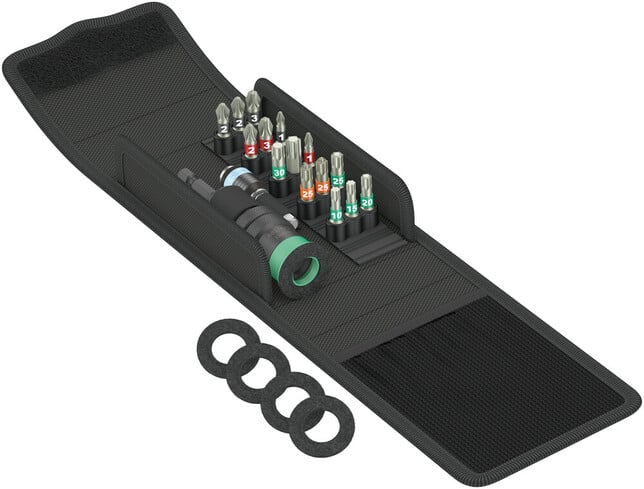 Kompaktná sada náradia Wera so 17 najdôležitejšími skrutkovacími nástrojmi na skrutkovanie terasových palubiek. 1 držiak bitov s variabilným obmedzením hĺbky zašroubovania, s pružným krúžkom pre bezpečné uchytenie bitu, 4 náhradné plsťové krúžky, ktoré zabraňujú odreniu povrchu terasových palubiek pri skrutkovaní, 1 držiak bitov Rapidaptor Stainless s rýchloupínacou hlavou, 15 bitov Stainless v prevedení z nerezovej ocele na zabránenie cudzímu hrdzaveniu, identifikátor náradia Take it easy: S farebným označením profilu a značkou veľkosti pre jednoduché vyhľadanie požadovaného bitu.