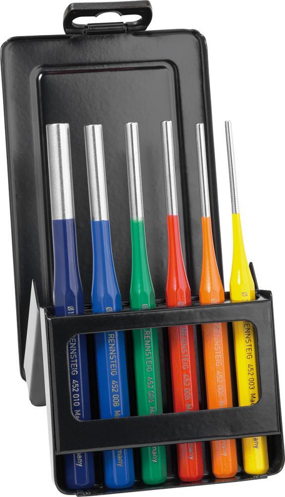 Sada vytláčačov závlačiek, extra tvrdé Provedenie: Podobne ako DIN 6450, z osmihrannej, priebežne zušľachtenej, vysoko legovanej nástrojovej ocele (59 HRC). O cca 9 % pevnejší než bežný vytláčač závlačiek. Chrómanovaný a s farebným práškovým náterom pre jednoduché priradenie priemeru, s bezpečnostnou úderovou hlavou. Dodáva sa v kazete z oceľového plechu. Výrobca: Rennsteig Werkzeuge GmbH, An der Koppel 1, 98587 Steinbach-Hallenberg, DE, +49368474410, info@rennsteig.com