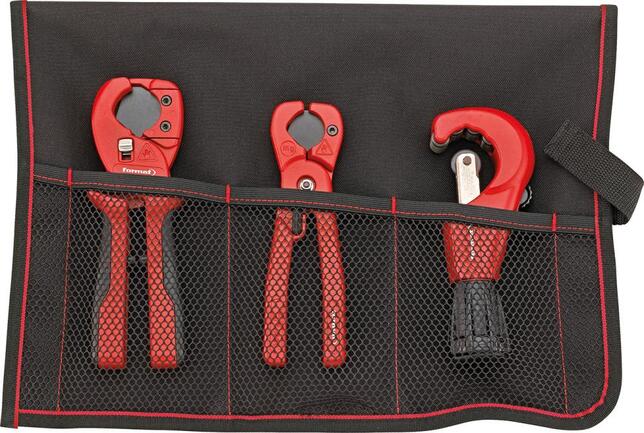 Sada rezákov na hadice a trubky Provedenie: Dodávka v nylonovej taške na kolieskach (600 Denier) so dvoma pútkami na zavesenie a suchým zipsom. Obsah sady: 1 teleskopický rezák trubiek Kompakt 1/8–1.3/8" (3–35 mm) Telo z tlakovej zliatiny horčíka, rezací koliesko z vysoko legovanej a kalenej ocele, vymeniteľné bez použitia nástrojov. 4 vodidlá s aretáciou pre rezanie blízko obruby zabraňujú odskoku alebo skĺznutiu. Regulácia tlaku sa vykonáva pomocou vretena s ľahkým chodom, uloženého v oceli. Mimo to disponuje rezák trubiek vytiahnuteľným odhrotovacím ostrím. Veľkorozmerná kovová rukoväť s náhradným rezacím kolieskom (obsiahnuté v objeme dodávky). Pre presné rezanie medených, mosadzných, hliníkových a tenkostenných oceľových trubiek. 1 Nožnice na hadice 0–22 mm Telo tlakovej zliatiny horčíka, čepeľ s PTFE povrchom so špicatým ostrím zabezpečujúcim ľahký a jednoduchý prienik do materiálu. S rozvíracou pružinou a jednoručným zamykaním. Pre presné jednoručné rezanie hadíc aj s textilným zosilnením, napr. z aramidových vlákien. 1 nožnice na hadice a trubky 0-28 mm Telo tlakovej zliatiny horčíka, čepeľ s PTFE povrchom so špicatým ostrím zabezpečujúcim ľahký a jednoduchý prienik do materiálu. S rozvíracou pružinou a jednoručným zamykaním. Kĺb pozostáva z osi v ocelovom uložení s ihlovým ložiskom. Rukoväte s mäkkými vložkami pre tlmenie nárazov. Pre presné jednoručné rezanie hadíc aj s textilným zosilnením, napr. z aramidových vlákien, mäkkých plastových trubiek, napr. PEX, PE, PB atď., ako aj tenkostenných plastových trubiek. Výrobca: Einkaufsbüro Deutscher Eisenhändler GmbH, EDE Platz 1, 42389 Wuppertal, DE, +4920260960, webkontakt@ede.de