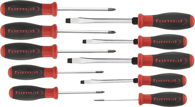 Sada skrutkovačov s 2-složkovou rukoväťou, 10 kusov Provedenie: Z vysoko legovanej špeciálnej ocele. Guľatá čepeľ so špeciálnou povrchovou úpravou pre vyšší krútiaci moment a rozmerovú presnosť. 2-složková plastová rukoväť s veľkou mäkkou ergonomickou zónou pre lepšie uchopenie, ochranou proti odkutáleniu a reliéfnou hlavou. Výrobca: Einkaufsbüro Deutscher Eisenhändler GmbH, EDE Platz 1, 42389 Wuppertal, DE, +4920260960, webkontakt@ede.de