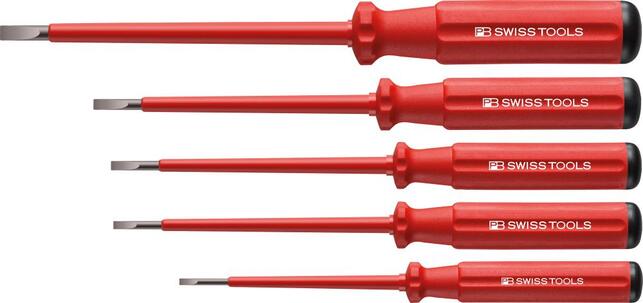 Sada skrutkovačov VDE, ploché Provedenie: Z vysoko legovanej pružinovej ocele, s okrúhlou čepeľou. S prehnutou dvousložkovou rukoväťou SwissGrip, ktorá neklzne ani v mokrých rukách, dobrý prenos krútiaceho momentu. Odolná voči rozpúšťadlám, olejom, kyselinám a soľiam. Okrem toho majú skrutkovače na hlave vyrazený symbol farebného kódovania, zakončenie a veľkosť. Rukoväť a čepeľ s izoláciou do 1000 V AC / 1500 V DC podľa IEC / ČSN EN 60900. Výrobca: PB Swiss Tools AG, Bahnhofstrasse 24, 3457 Wasen/Bern, CH, +41 34 437 71 71, info(at)pbswisstools.com