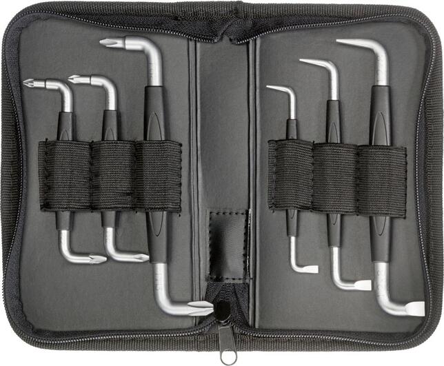 Sada úhlových skrutkovačov plochých a krížových Provedenie: Čepeľ z chrómvanádiovej ocele, s hodvábne matným chrómovaním, s hrotmi otočenými o 90° a 180°. Dodávka v textilnej taške. Výrobca: Einkaufsbüro Deutscher Eisenhändler GmbH, EDE Platz 1, 42389 Wuppertal, DE, +4920260960, webkontakt@ede.de