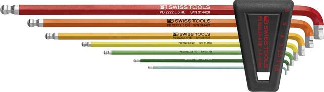Sada dlhých imbusových kľúčov pre šesťhran, s guľovou hlavou a so skráteným ramenom 90-100°, Rainbow Vyhotovenie: DIN 911 L, ČSN ISO 2936 L. Z vysoko legovanej pružinovej ocele, zakalené, pochromované a opatrené práškovým lakom. S guľovou hlavou a skráteným pružným ramenom zalomeným o 90°–100°. Poloha 90° pre nasadenie, miernym ťahom je možné zväčšiť skrutkovací uhol na 100°. Povrchová úprava v rozmanitých farbách uľahčuje priradenie otvorov kľúčov. Dodávame v vreckovom držiaku. Použitie: Ideálne na skrutkovacie práce v stiesnených miestach s ťažkým prístupom. Upozornenie: veľkosti 1,5–2 mm s pevným 90° uhlom. Výrobca: PB Swiss Tools AG, Bahnhofstrasse 24, 3457 Wasen/Bern, CH, +41 34 437 71 71, info(at)pbswisstools.com