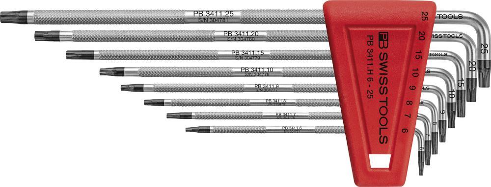 Sada zástrčných kľúčov pre TORX®, dlhé Provedenie: Z vysoko legovanej pružinovej ocele, zakalené a pochromované. Čepeľ ryhovaná pre práce vo vlhkom alebo zaolejovanom prostredí. Dodáva sa v plastovom držiaku. Výrobca: PB Swiss Tools AG, Bahnhofstrasse 24, 3457 Wasen/Bern, CH, +41 34 437 71 71, info(at)pbswisstools.com