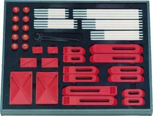 Sada upínacích prvků Provedení: Sada z plastu, obsahuje 55 prvků. Upínací příložky, upínací podložky a matice z vysoce pevného plastu PBT, červená barva. Kolíky s oboustranným závitem, hliník, eloxovaný Použití: Vhodné k použití na 3D souřadnicových měřicích strojích, gravírovacích strojích a strojích pro elektrickou erozi a pro upínání, které vyžaduje pouze malou upínací a přídržnou sílu. Možná upínací síla (cca 500 N) v závislosti na vybraném poměru páky opěry upínacích příložek je dosažena dotahováním matice na ozubení. Pokud se upínací prvky vzpříčí, lze pomocí otevřeného klíče uvolnit matici. Výhody: • Hmotnost pouze 1/4 v porovnání s hliníkovými prvky a 1/10 v porovnání s ocelovými prvky • Odolnost proti rzi z potu z rukou • Velmi snadné zacházení • Žádné poškození strojního stolu a obrobku • Všestranně kombinovatelné Hersteller: Andreas Maier GmbH & Co KG, Waiblinger Str. 116, 70734 Fellbach, DE, +4971157660, amf@amf.de