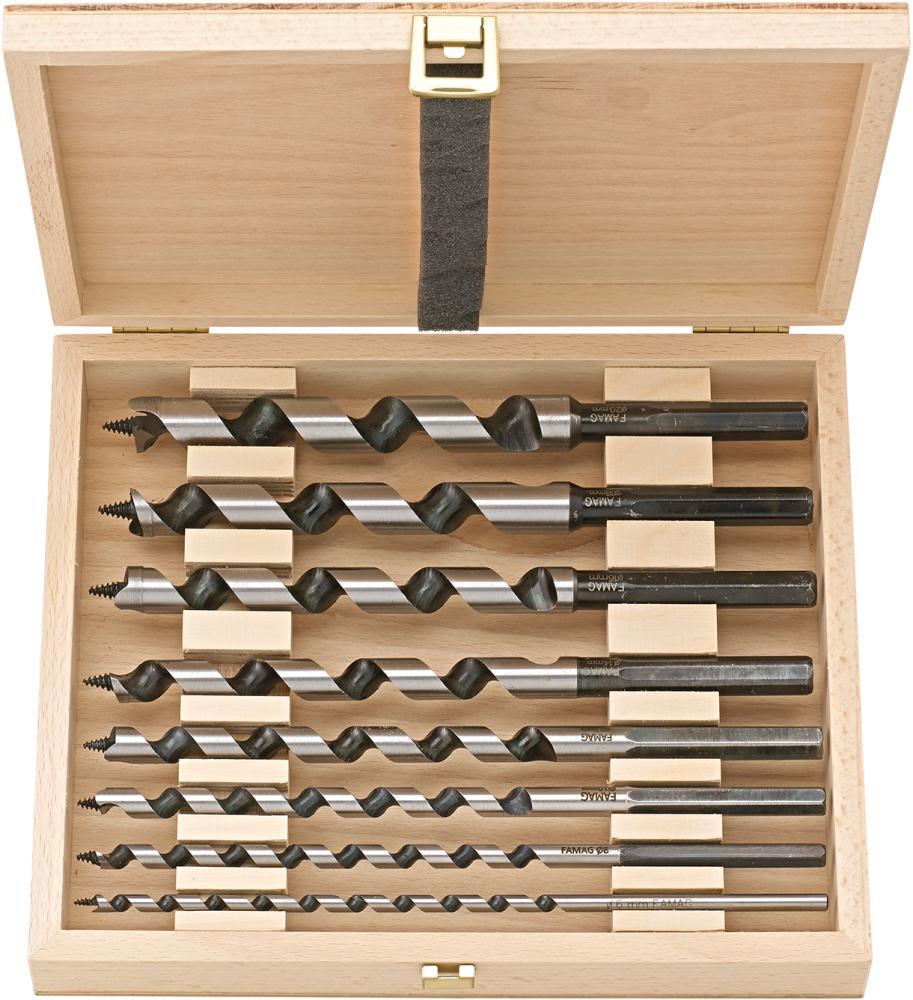 Sada hadovitých vrtákov LEWIS Provedenie: Nástrojová oceľ, frézovaná, s kulatou spirálovou drážkou, šesťhrannou stopkou a odsadenou hlavou. Dodáva sa v drevenej krabici. Použitie: Špeciálne pre hlboké otvory v mäkkom a európskom tvrdom dreve pomocou ručných vŕtačiek, výkonných akumulátorových vŕtačiek a stolárskych zariadení. Výrobca: Famag Werkzeugfabrik GmbH & Co. KG, Rather Str. 29, 42855 Remscheid, DE, +49219192840, info@famag.com