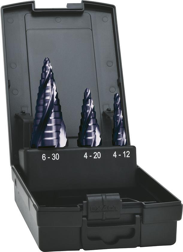 Sada univerzálnych stupňovitých vrtákov Provedenie: Dodáva sa v robustnej, vysoko kvalitnej plastovej kazete s automatickou narovnávacou funkciou vrtákov pri otvorení. Výrobca: EXACT GmbH & Co. KG, Am Eichholz 19, 42897 Remscheid, DE, +492191362500, info@exact.info