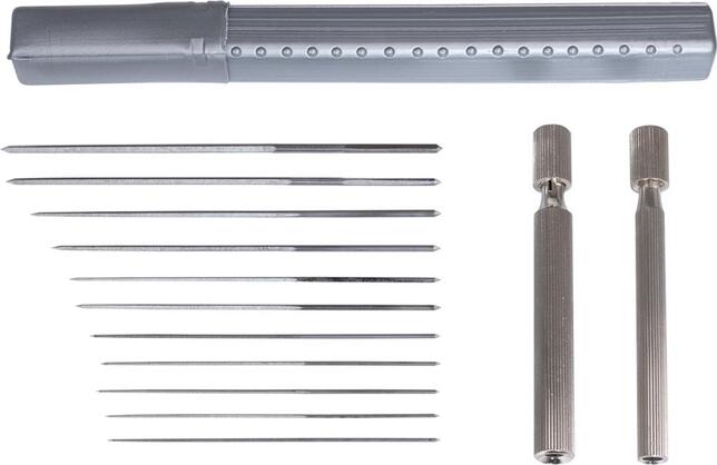 Sada výstružníkov na trysky Provedenie: Z špeciálnej nástrojovej ocele, induktívne tvrdené, zábrus, kónický tvar. 5hranný, tvar s štvorhrannou stopkou k upevneniu na kovový držiak. Dodávame v plastovom puzdre. Použitie: K čisteniu trysiek. Výrobca: Kleinbongartz & Kaiser oHG, Heinrich-Hertz-Str. 5, 40721 Hilden, DE, +4921039754400, info@KUKKO.com