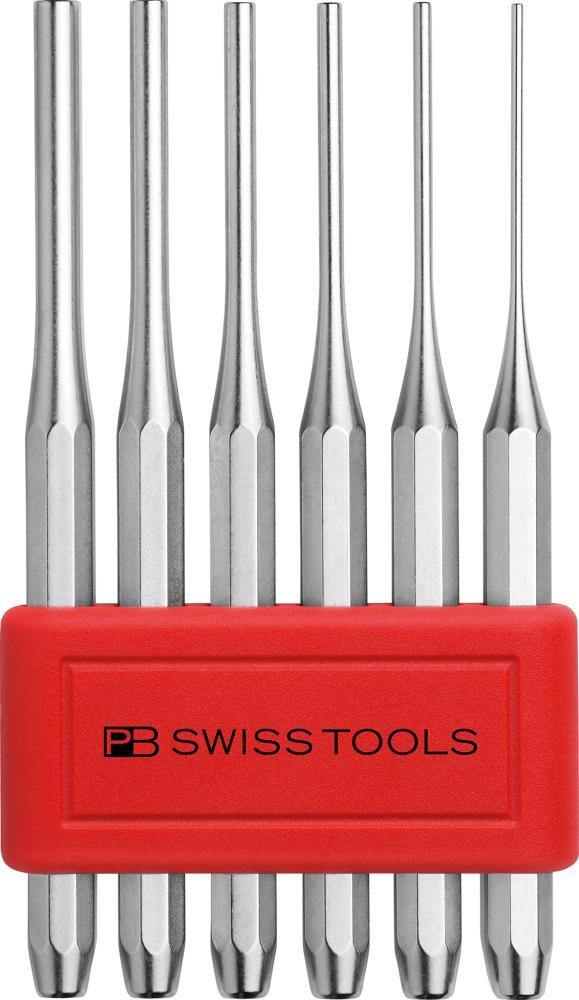 Sada vytláčačov závlačiek Provedenie: DIN 6450 D, z osmihrannej chróm-molybdén-vanádiovej samokaliteľnej ocele, valcový tvar trnu. So zušľachtenou úderovou hlavou, čím sa takmer vylučuje vznik vydutí, lemov a štípania. Trn a stopka kalené. Dodáva sa v plastovom držiaku. Výrobca: PB Swiss Tools AG, Bahnhofstrasse 24, 3457 Wasen/Bern, CH, +41 34 437 71 71, info(at)pbswisstools.com