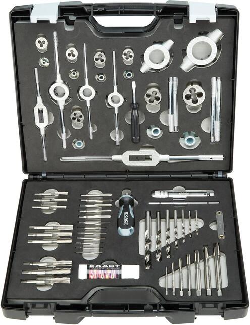 Sortiment závitových oček a závitníkov Provedenie: Dodáva sa vo veľmi robustnej a vysoko kvalitnej plastovej kazete s vyberateľnými penovými vložkami na odkladanie do systémov regálov a dielenských vozíkov. Obsah sady: 7 ks sady ručných závitníkov 3diel., DIN 352, M3; 4; 5; 6; 8; 10; 12 7 ks strojových závitníkov, DIN 371/376, M3; 4; 5; 6; 8; 10; 12 7 ks spirálových vrtákov, DIN 338, Ø 2,5; 3,3; 4,2; 5,0; 6,8; 8,5; 10,2 mm 7 ks závitových očiek, DIN EN 22568, M3; 4; 5; 6; 8; 10; 12 7 ks vedení M3; 4; 5; 6; 8; 10; 12 5 ks držiteľov závitového očka, DIN 225, 20 x 5; 20 x 7; 25 x 9; 30 x 11; 38 x 14 mm 2 ks vratidiel, nastaviteľné, DIN 1814, veľkosť 1; 2 1 ks ručnej odjehlovačky Ø 12,4 mm 1 ks držiteľ nástroja Gr. 2 1 vrtacia pasta, 20 g 1 ks kalibr na závity štandardný 1 ks skrutkovač štandardný 1 príručka rezania závitov Výrobca: EXACT GmbH & Co. KG, Am Eichholz 19, 42897 Remscheid, DE, +492191362500, info@exact.info