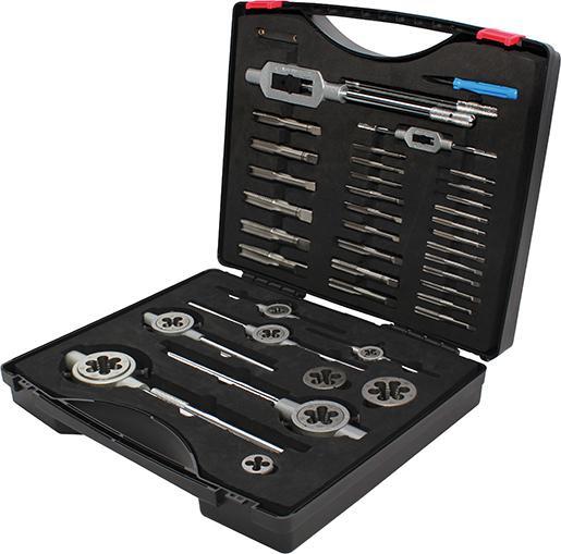 Sada ručných závitníkov a závitových očiek, UNC 9 ručných závitníkov, DIN 2184 (3diel.), ¼; 5/16; 3/8; 7/16; 1/2; 5/8; ¾; 7/8; 1” 9 závitových očiek, DIN EN 22568, ¼; 5/16; 3/8; 7/16; 1/2; 5/8; ¾; 7/8; 1” 2 vratidlá, DIN 1814, č. 1.1/2; 4 6 držiakov závitového očka, DIN 225, 20x7; 25x9; 30x11; 38x14; 45x18; 55x22 1 skrutkovač 1 závitníkový kalibr Výrobca: Einkaufsbüro Deutscher Eisenhändler GmbH, EDE Platz 1, 42389 Wuppertal, DE, +4920260960, webkontakt@ede.de