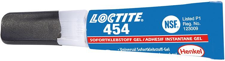 Sekundové lepidlo LOCTITE® 454 Provedenie: Univerzálne gélové sekundové lepidlo, viskozita gélu, s P1 NSF reg. č. 123009. Použitie: Ideálne na použitie na zvislých plochách a nad hlavou. Lepí papier, drevo, korok, penovú hmotu, kožu, lepenku, kov a plast. Výrobca: Henkel AG & Co. KGaA, Henkel-Teroson-Str.57, 69123 Heidelberg, DE, +4962217040, corporate.communications@henkel.com
